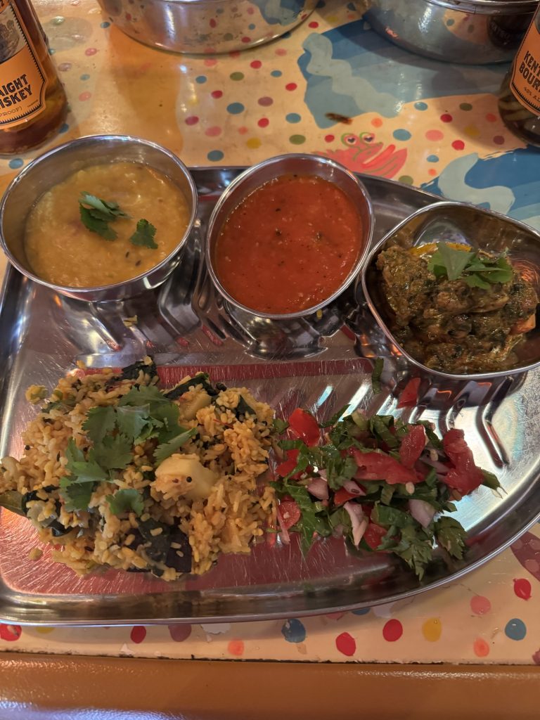 水分少なめのスパイスお粥を炒めて作ったほうれん草とじゃがいものブナキチュリは、栄養価が高く消化に良いのでお腹の調子が悪い時におすすめ。