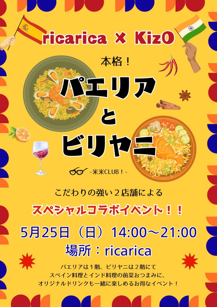 ricaricaの魚介たっぷり絶品パエリアと、KizOのスパイス香る本格ビリヤニを同時にお楽しみいただけるスペシャルコラボイベントを開催します。